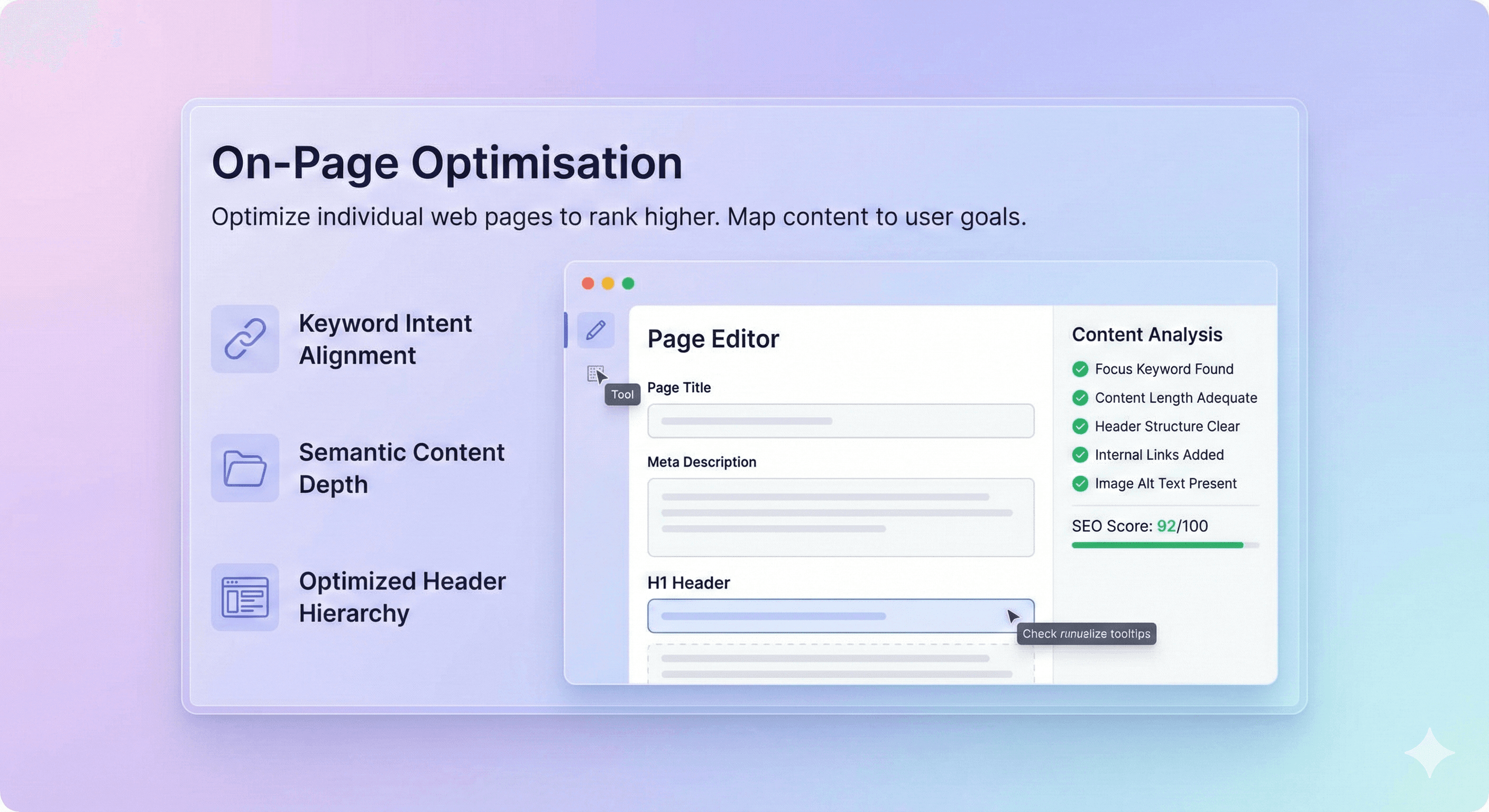 This focuses on optimizing individual web pages to rank higher by making content relevant and providing a great user experience. Keyword Intent Alignment: Map content to user goals.